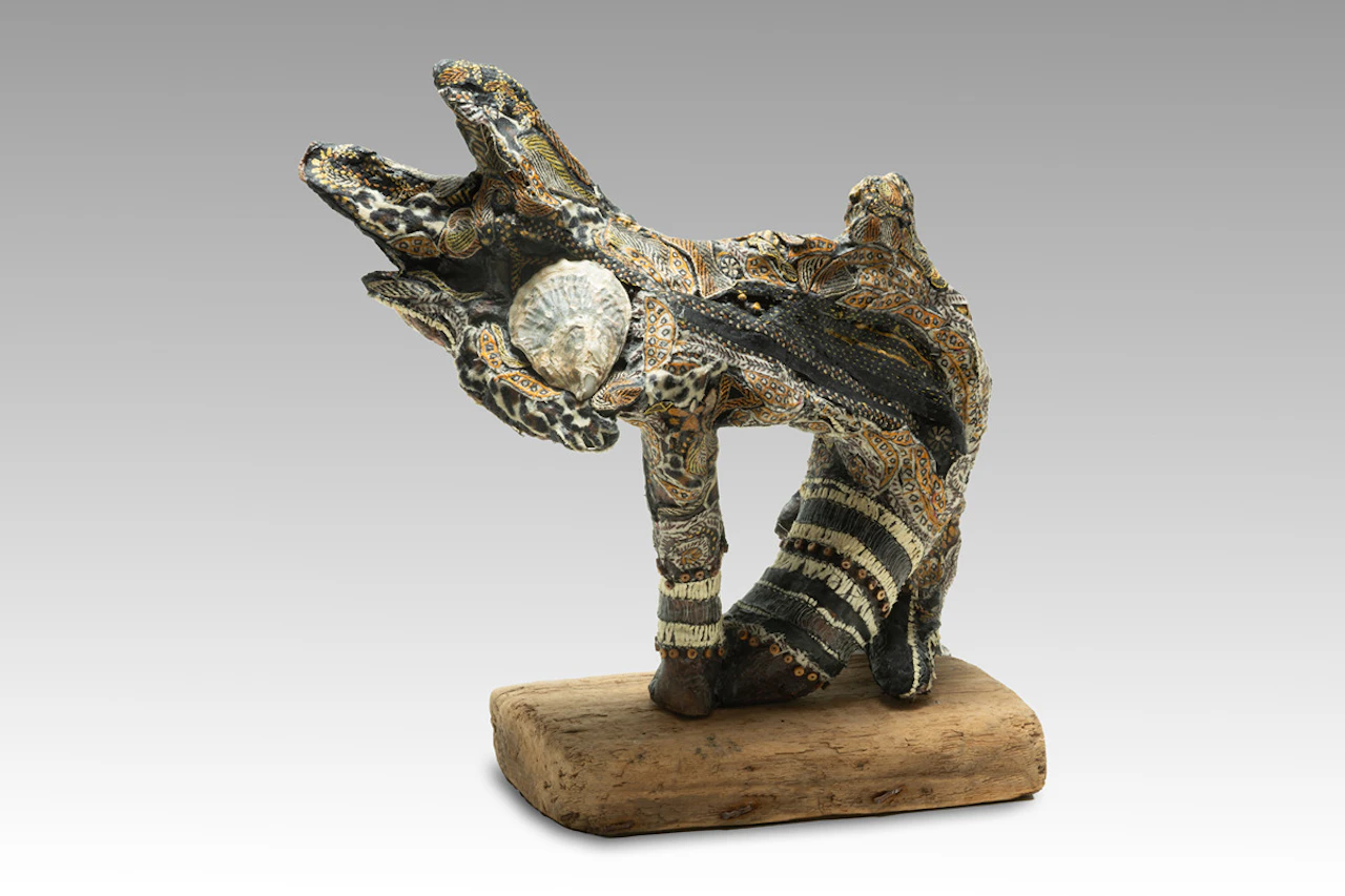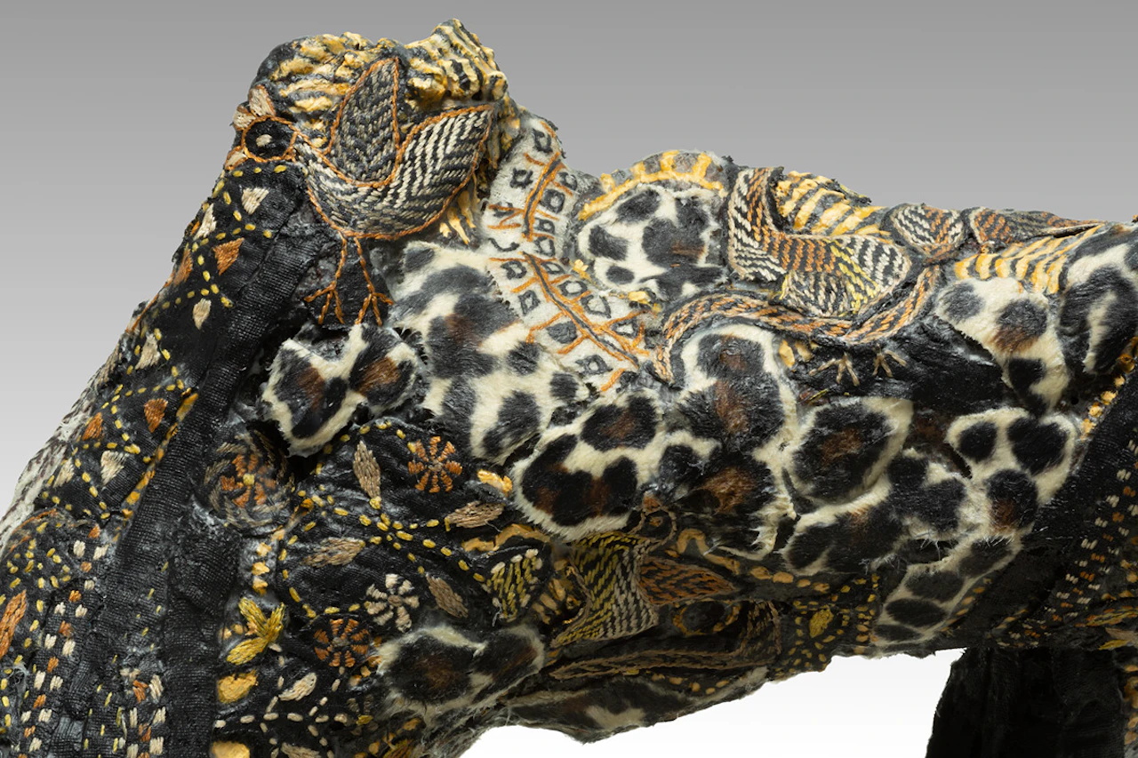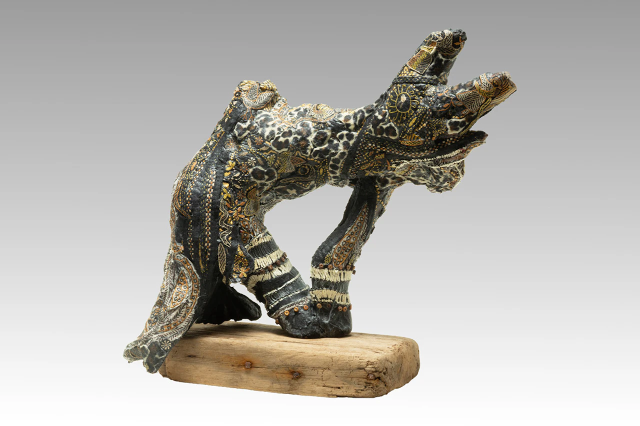 ‘Small Obsessions’ series involves found objects and materials juxtaposed with smaller natural forms such as charred wooden blocks eroded by the sea. The more intimate scale of these works makes them feel more precious and ornamental. Incorporating intricate bead work and aspects of Indian miniature painting is a way connecting with my cultural heritage and deliberately slowing down the creative process in a world where things seem to be constantly in a state of flux.