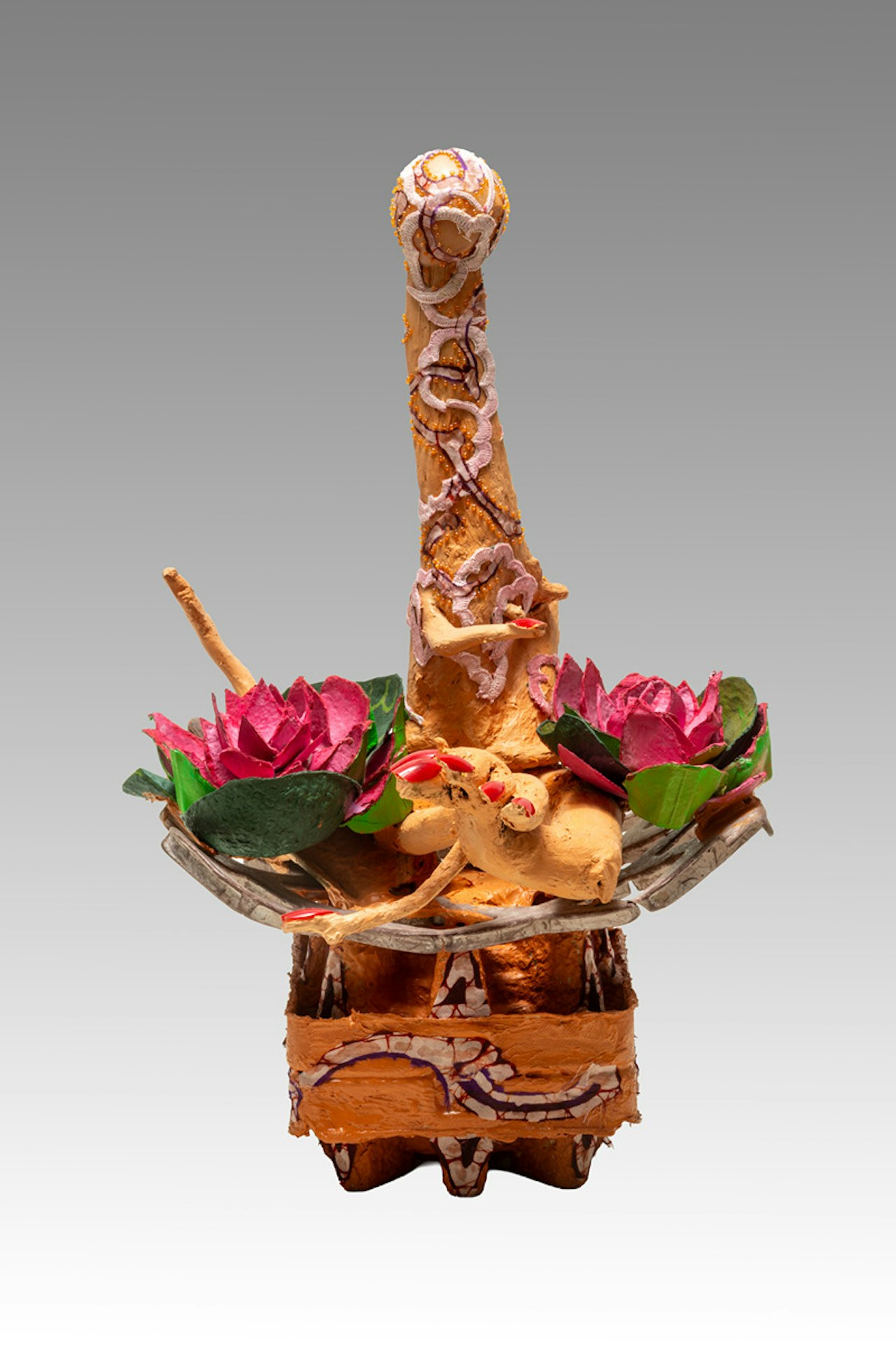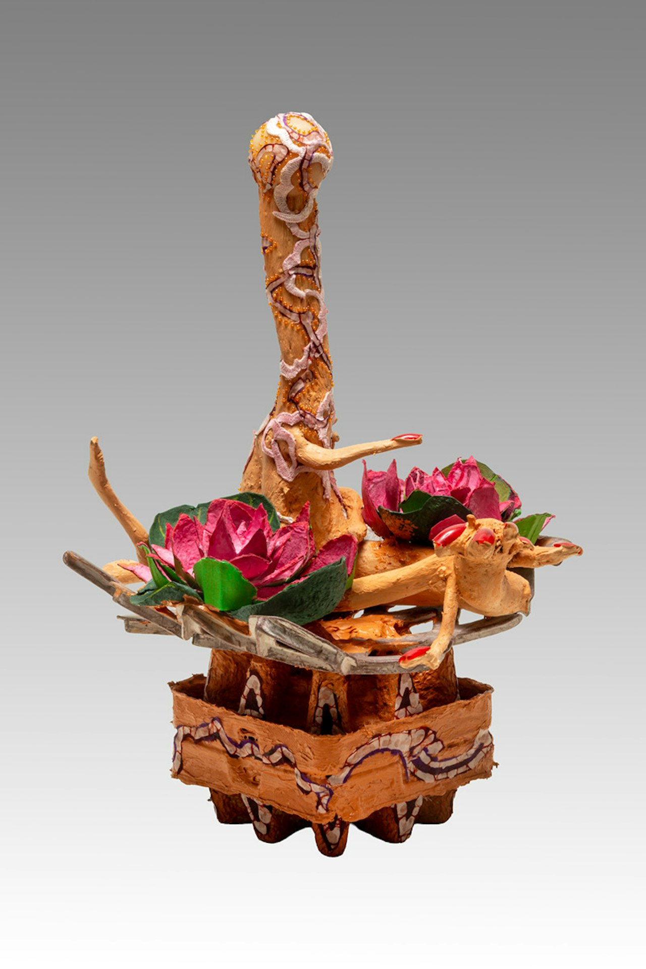 In the Organic Excursions series found objects and material are combined with more natural forms such as large branches discovered in woodlands across the UK. I wanted to explore the tension between natural and synthetic materials, how they can co-exist and the resulting structures can come to resemble organic, sometimes alien yet recognizably human forms. Using beadwork and textiles, which originate from the South Asian Culture where I grew up, I continue to be fascinated by sparkling jewelry, decorative accessories and ornate textile patterns from childhood.